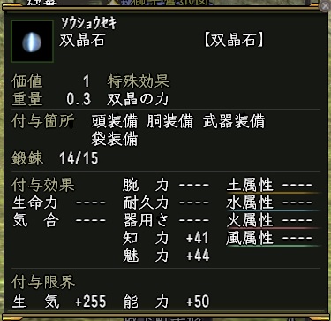 面倒になったので、結局既製品の知力40石(70万貫)と魅力40石(100万貫)を購入し、倉庫に眠っていた双晶石に入れました。