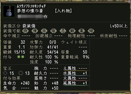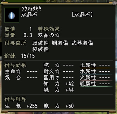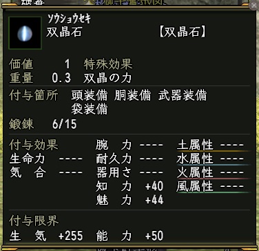 面倒になったので、結局既製品の知力40石(70万貫)と魅力40石(100万貫)を購入し、倉庫に眠っていた双晶石に入れました。